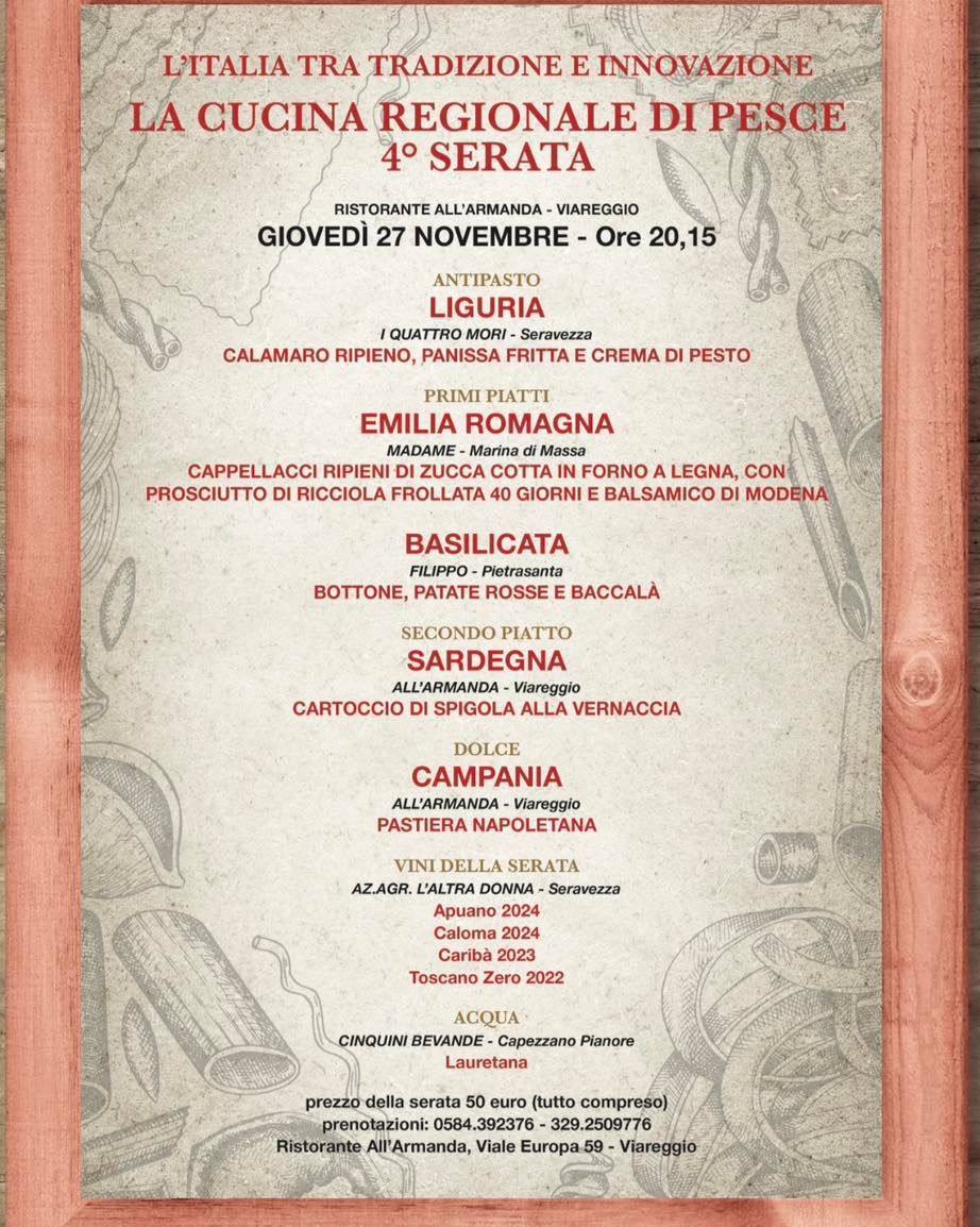 Giunto ormai alla quarta edizione, il festival conferma la sua formula vincente: quattro Cene-Evento, organizzate nei quattro giovedì di novembre, durante le quali cuochi, osti e ristoratori della Versilia si ritrovano per cucinare insieme, condividere esperienze e celebrare la ricchezza delle tradizioni locali.